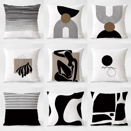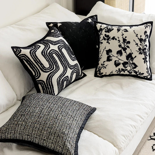 - Monochrome chic : coussins noir, gris et blanc pour un salon graphique.