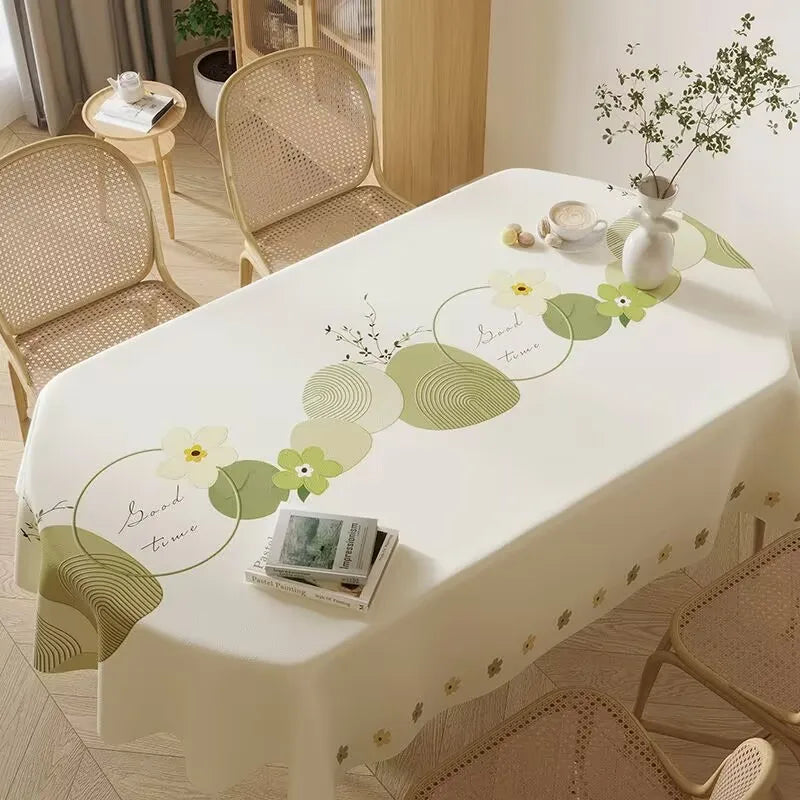 Nappe ovale anti tache à motif floral, bols colorés, panier de fruits et bouquet de fleurs sur un coin de la table. Les miettes, le thé ou le chocolat chaud se nettoient en un instant, sans stress ni contraintes.